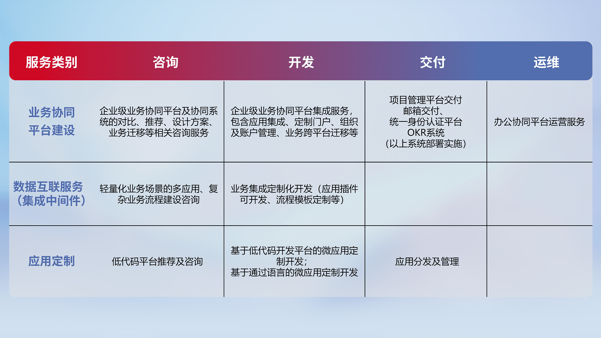 针对钉钉、、企微、、、、IDaas等平台级产品提供产品的规划、、方案、、交付、、、、定制化开发等服务,,实现如统一协同办公、、智能客户服务、、、、混合会议管理、、、智能数据查询、、、、等业务场景,,,实现数字化转型。。。。