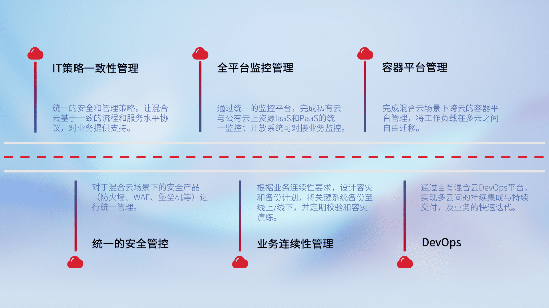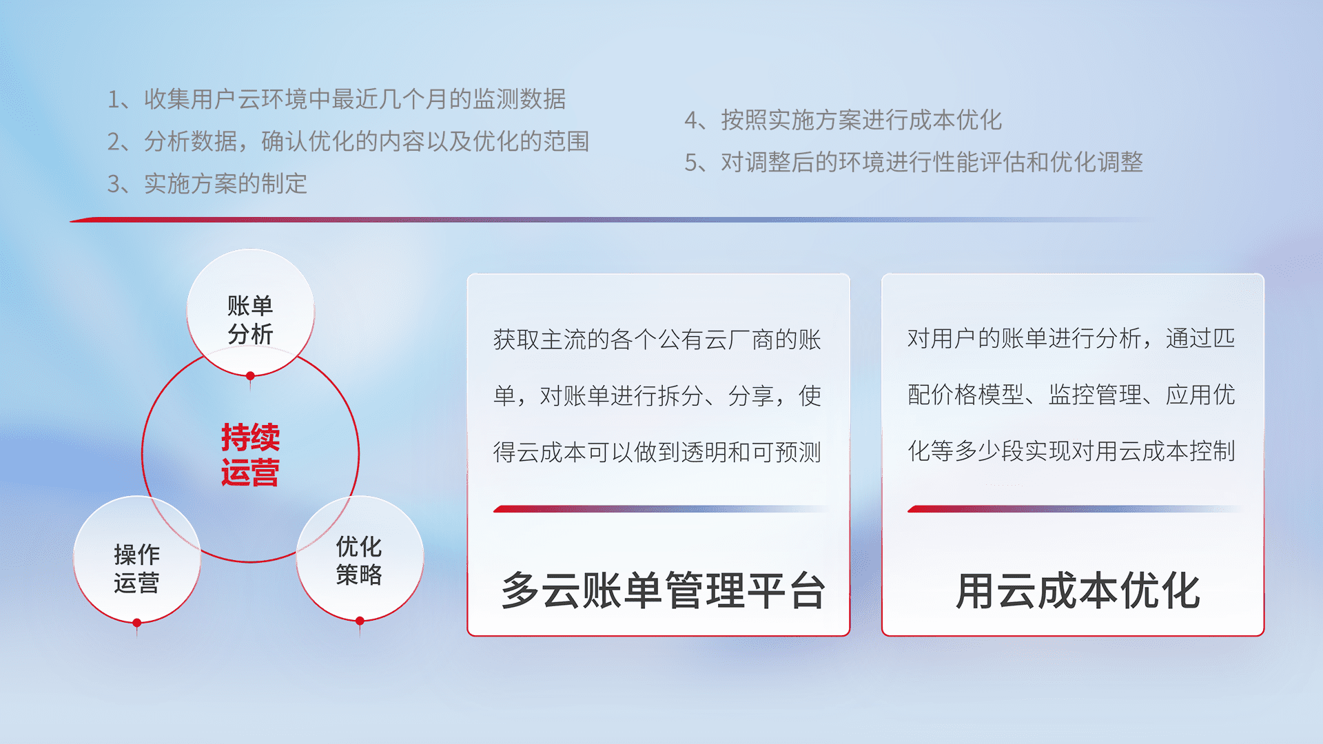 通过多云纳管,,以统一的资源数据模型把客户的云资源进行抽象和封装,,,进而实现对多云资源的统一操作,,保障云资源管理的可靠性、、稳定性与可用性。。。。量身定制化运维内容,,,配置、、开发运维、、、、补丁管理、、、备份、、、、监控、、、、认证和访问管理、、、、审计和日常巡检等,,,保障在用云过程中的可靠度,,稳定度以及高可用率。。。。